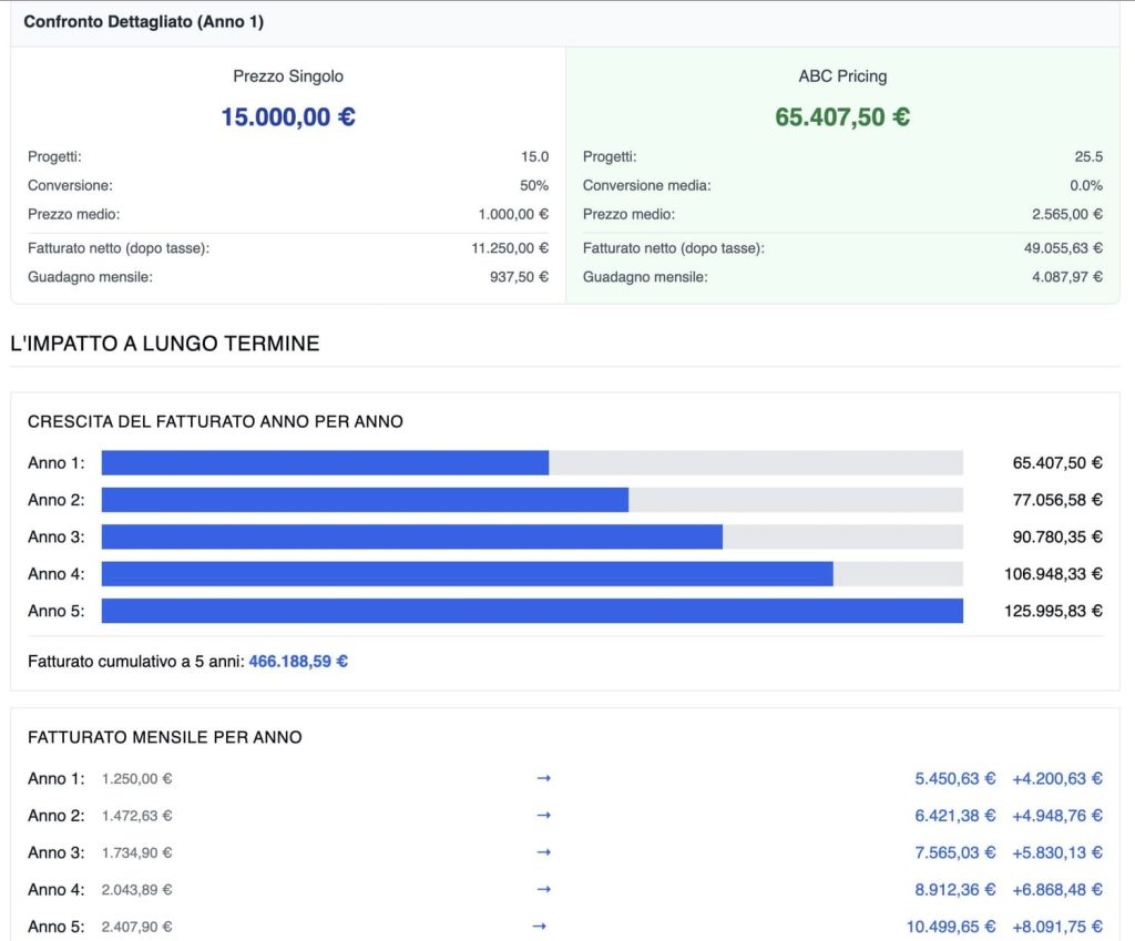 Il Calcolatore Avanzato ti mostra proiezioni reali, margini, guadagni previsti e crescita futura, mese per mese e anno per anno.
